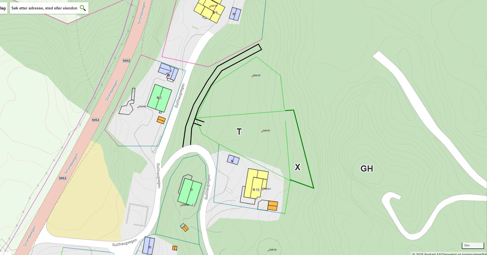 Tomta er merka med T. Gullhaug er merka med GH. Tilleggsarealet X kan kjøpast om du ønskjer det. Ny veg er teikna med svart strek. Den er inkluder i tomteprisen, fram til tomtegrensa.