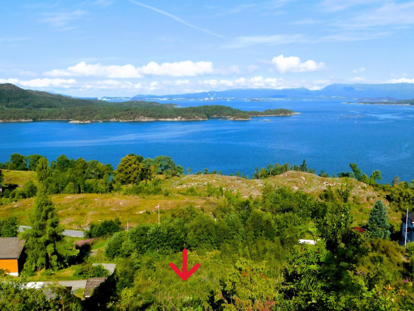 Tomta er det frodige arealet heilt nede i bildet, det den raude pila peikar. Hovudvegen skimtar du i venstre kant, ein tredjedel opp frå nedre kant. Tilkomstvegen til tomta di ser du også, nede i venstre hjørne. Det er Fjelbergøy som stikk seg inn i fjorden frå venstre. Stord i bakgrunnen. Bildet er tatt frå GULLHAUG.