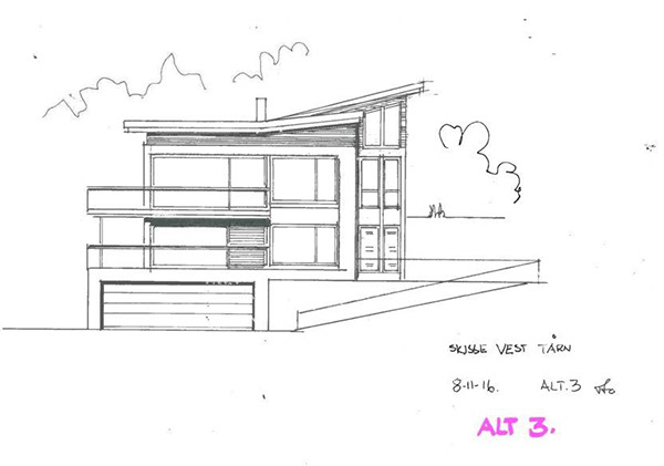 Same huset som ovanfor, men her sett frå sør. Tårnet i midten har utsikt mest vestover mot fjorden. Den lune hagen kan du ha på oppsida, altså til høgre på denne skissa.