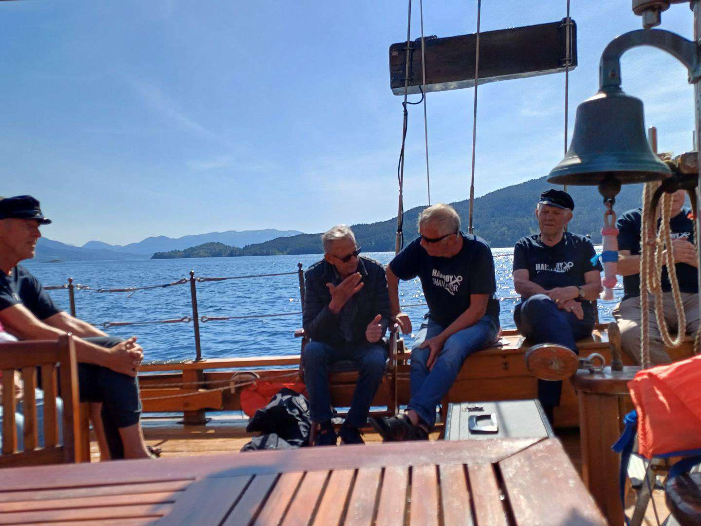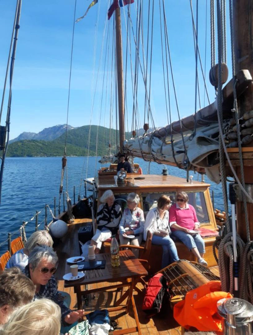 Alle 12 medlemmene i koret var snart på plass, og dei hadde 9 damer med seg. Så me var ein fin gjeng om bord, i det fantastiske solskinet. For det meste landkrabbar, men nokon med solid erfaring frå det våte element.